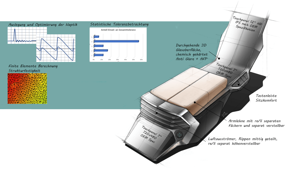 You will receive a finely tuned final product proposal (presentations, CAD data, prototypes, documentation), illustrated here by using the example of a vehicle center console.